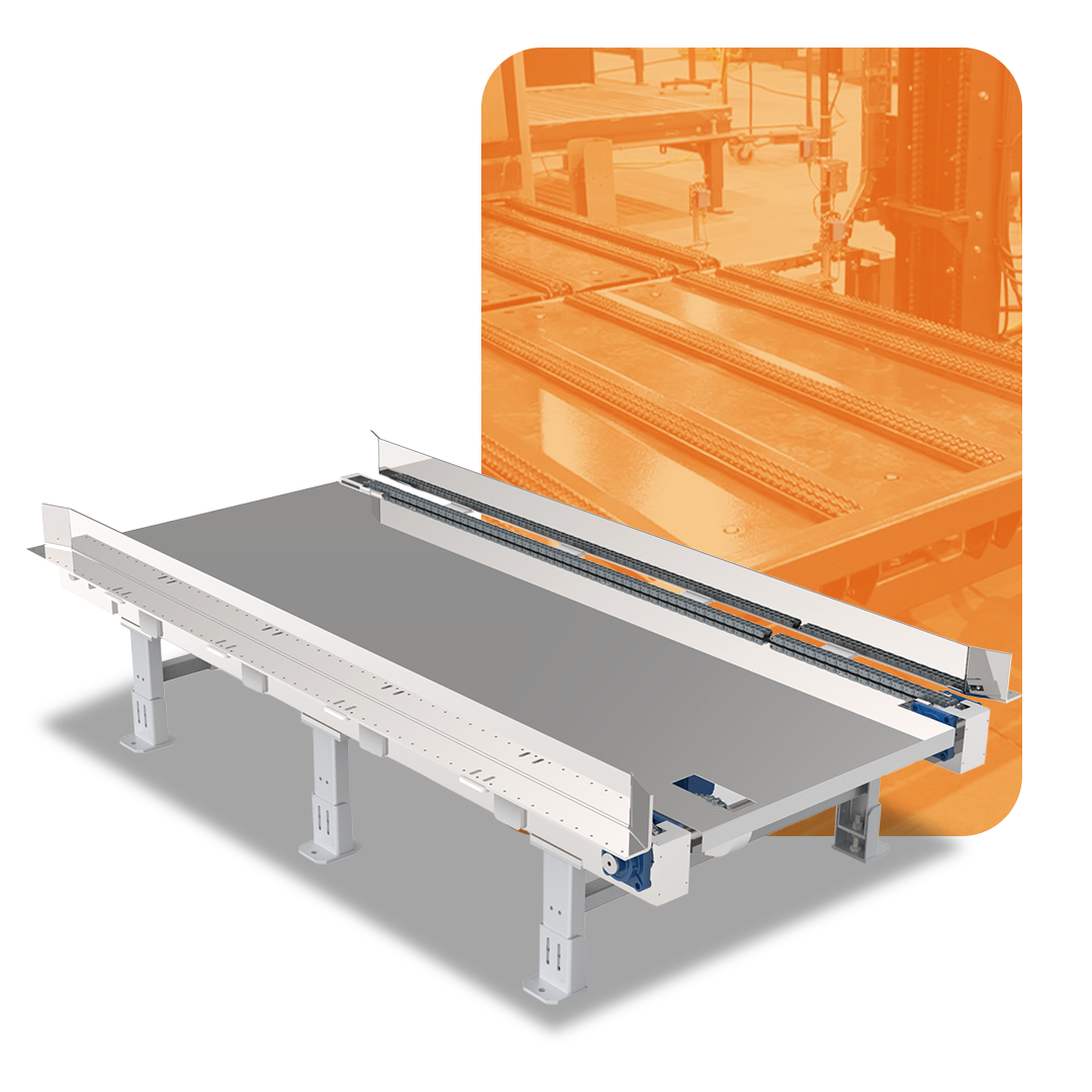 • Lift & Transfer Mechanism: Raises product above rollers for clean side transfer.